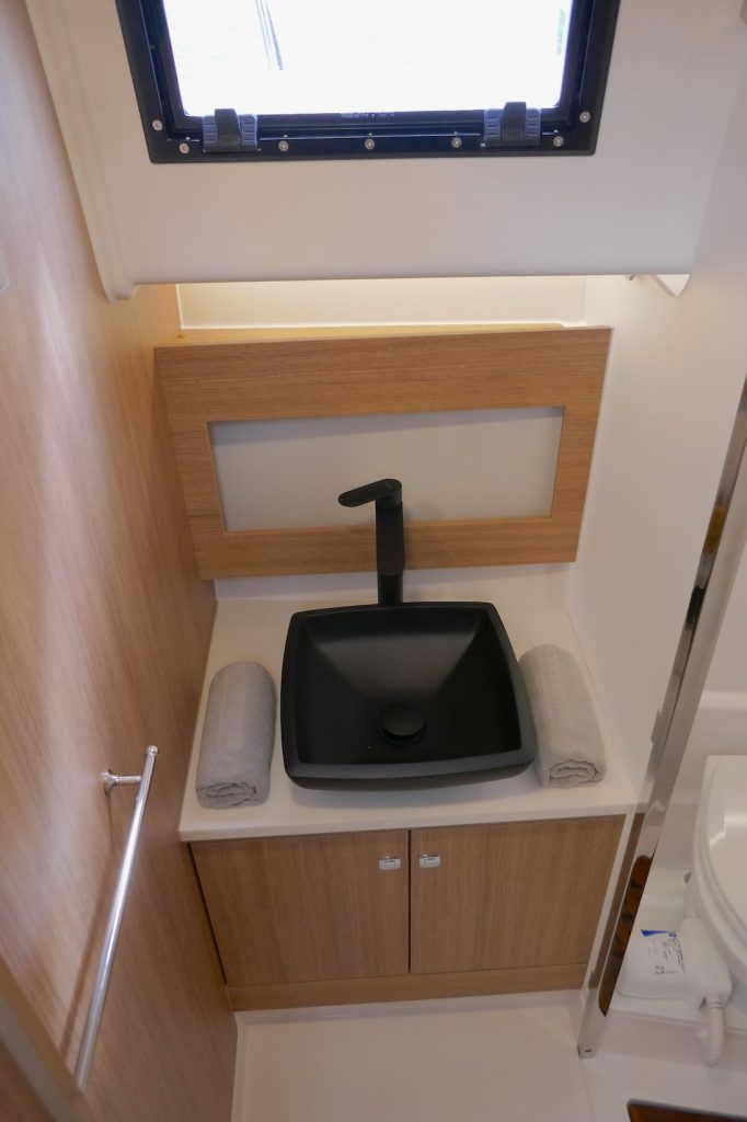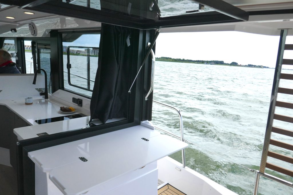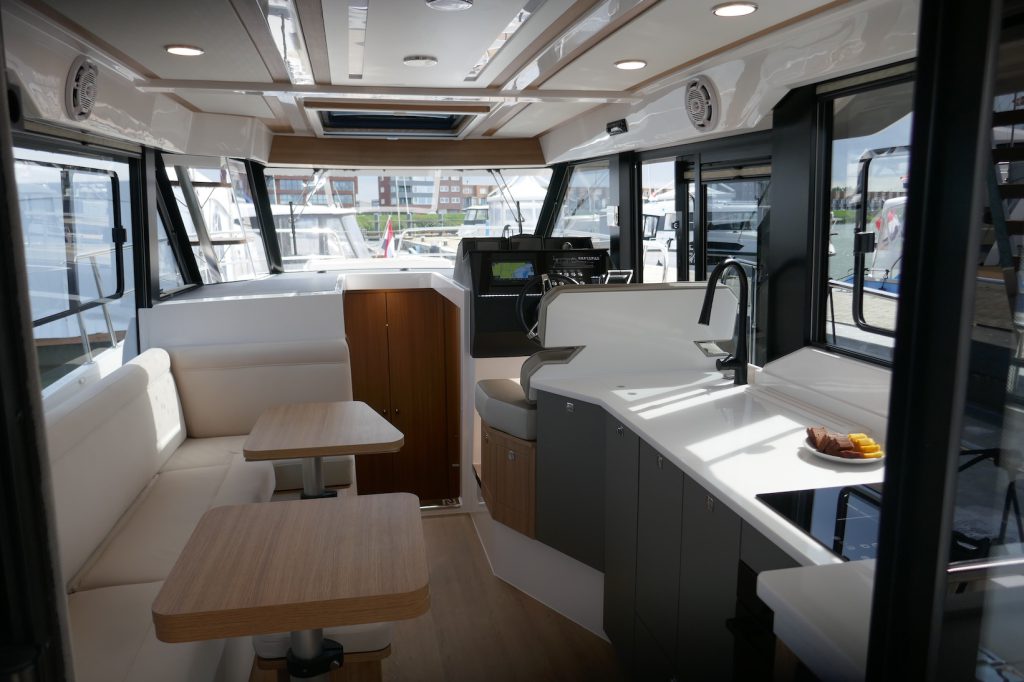 De salon draait om de prachtige stuurplek aan stuurboord. Daar is ook een schuifdeur naar het gangboord. Het dashboard is uitgebreid maar overzichtelijk en het uitzicht is er uitstekend. Er is een groot dakluik en de rest van het dak is zoals gemeld belegd met zonnepanelen. Aan bakboord is een L-vormige zitplek rond twee tafels, waarvan de achterste uitklapbaar is. Ventileren kan met het dakluik, de schuiframen en de schuifpui. Koken en verwarmen doe je elektrisch. Aan stuurboord is een moderne, nette kombuis. En als optie is in de achterkuip een mooie barbecue gemaakt. Voorop is nog een groot zonnebed.