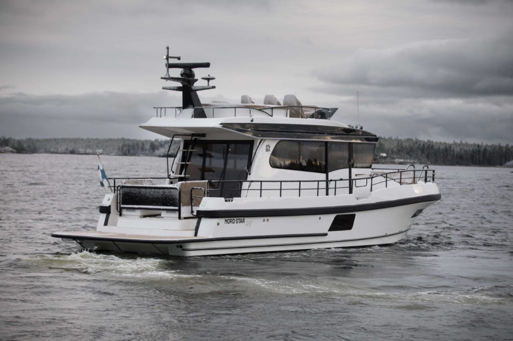 De Finse scheepswerf Nord Star is een autoriteit op het gebied van degelijkheid in jachten. Al hun jachten hebben een rondom beloopbaar dek met hoge relingen, een stuurhut met een negatief geplaatst raam. De opbouw is altijd voorzien van drie deuren, twee aan de zijkanten en één aan de achterzijde. Dit betekent dat de beschutte stuurhut vanaf elke plek op het dek en op elk moment in slechts enkele stappen bereikbaar is. De 15,5 meter lange Nord Star 49+ biedt diverse loungeplekken, van de flybridge met L-vormige bank en kitchenette tot de lig- en eetgedeeltes op het voor- en achterdek en de drie hutten benedendek. De centraal gelegen eigenaarshut en de voorhut hebben elk een eigen badkamer. De eigenaarshut beslaat 12 vierkante meter. Met het maximale Volvo Penta motorvermogen van 1200 pk kan het jacht een snelheid van 37 knopen halen, mede dankzij de bijzondere kimmen aan het onderwaterschip.