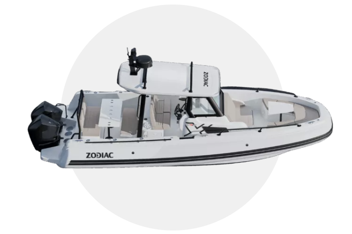 Zodiac staat op Boot Düsseldorf met de kleinere versie van de X10CC. Het gaat opnieuw om een center console RIB, maar deze is 8,60 m. lang en heeft een maximale motorisering van 2 x 250 pk. Voorin is een mooi ontworpen ruimte met U-vormige zit rond de tafel waar de bank aan de voorzijde van de console bij betrokken kan worden. Achterin is een zitje met twee banken rondom de tafel. Beide kunnen tot zonnebed worden getransformeerd. De prijs begint bij €150.000 ex btw.