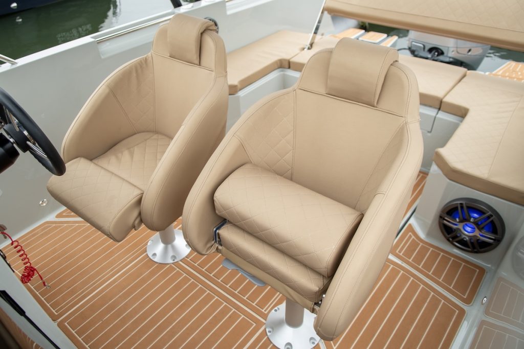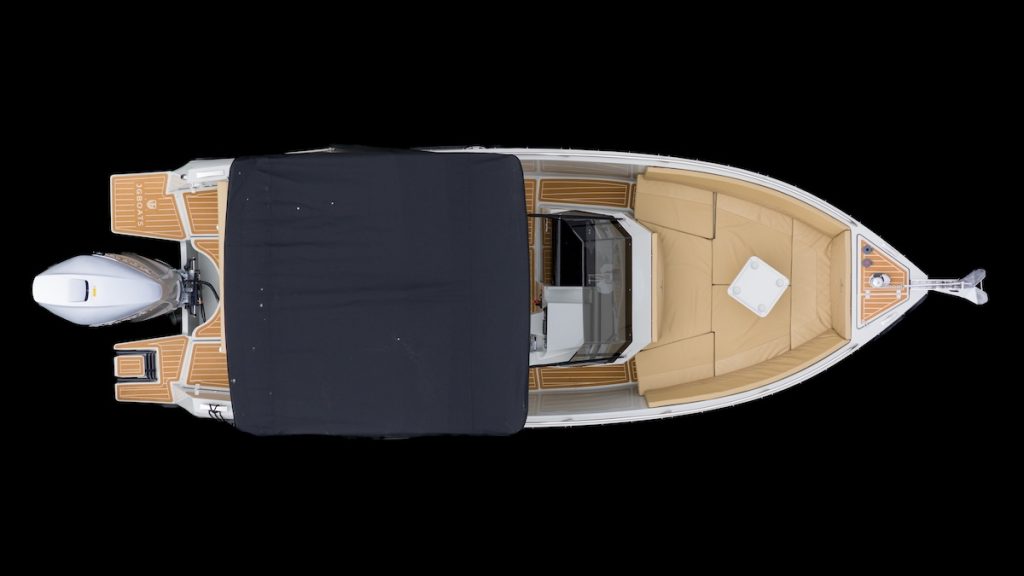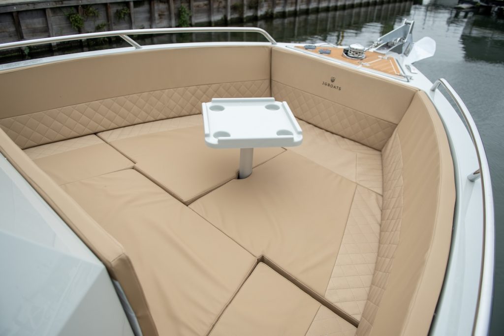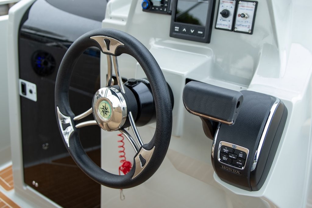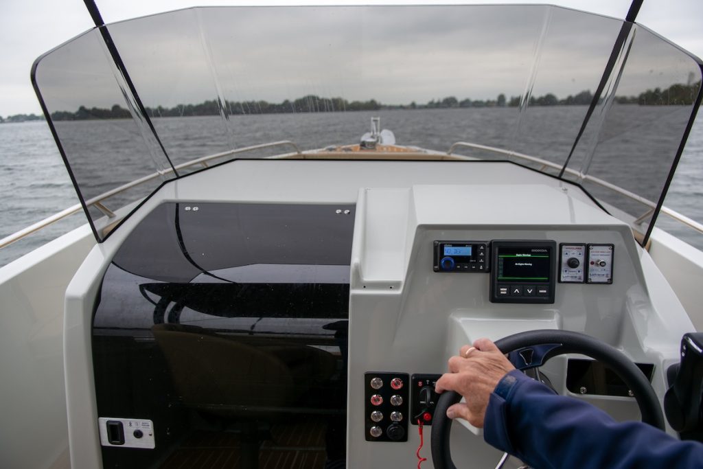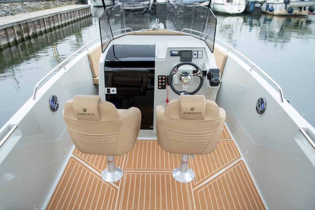 Op en in het potdeksel zijn lange rvs rails geplaatst, waaraan je goede houvast hebt. Deze Danté V800 heeft voorop een ankerkluis en pal daarachter een ruim zitgedeelte dat met vulkussens naar het zitje van de console tot zonnebed kan worden omgetoverd. Er is een kleine tafel midden in het zonnebed beschikbaar. De kussens zijn uitgevoerd met een ruitmotief en op strategische plekken is het logo van JG Boats in het kunstleer geborduurd. De stuurconsole met gebogen, plexiglas ruit is breed genoeg om er met twee man beschut achter te zitten. Deze centraal geplaatste console bevat als verrassing achter de gebogen plexiglas schuifdeur een kleine ruimte met toiletmogelijkheid. Het dashboard is simpel uitgevoerd met een centraal motorscherm, een radio, bediening van de ankerlier en zeven mooie drukknoppen voor verlichting, koelkast en pompen. En uiteraard een USB oplaadpoort.