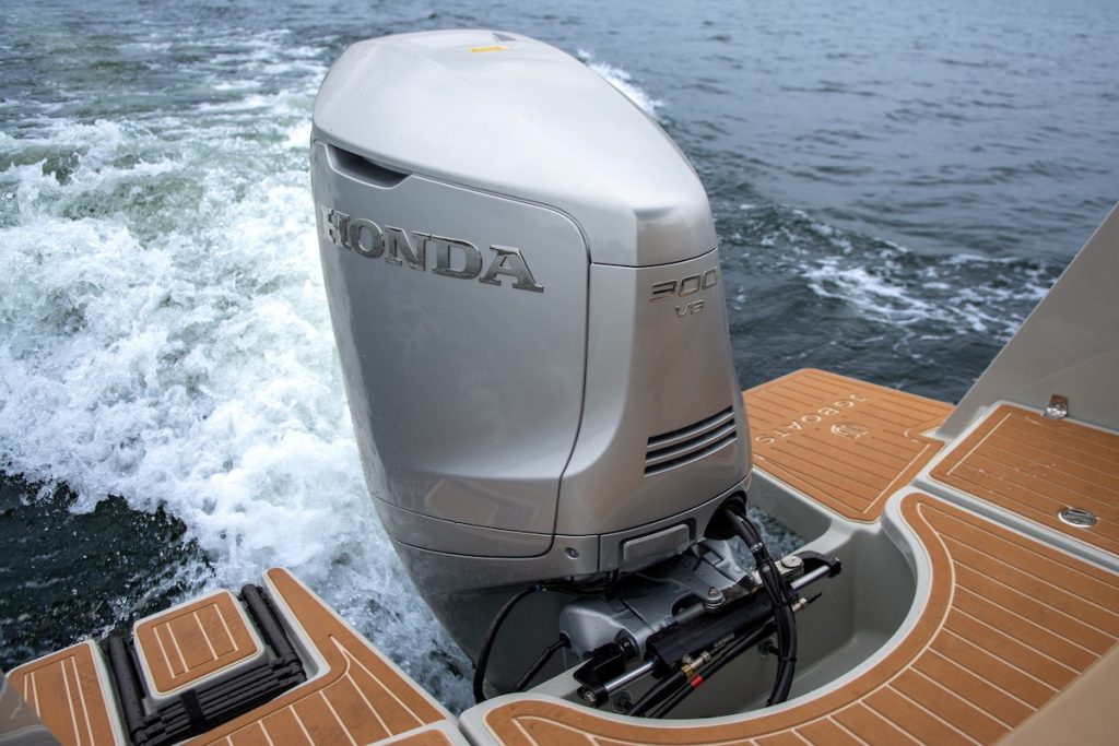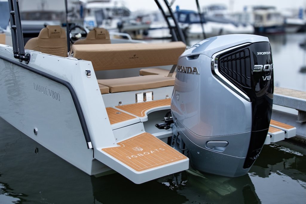 De maximale motorisering van de Danté V800 is met buitenboordmotoren tot 300 pk. En we hebben geluk, want deze boot heeft ook een 300 pk aan de spiegel, namelijk de spiksplinternieuwe Honda BF 300. Het is het eerste exemplaar in ons land en daar is JG Boats enorm trots op. Want deze motor is enorm gewild vanwege de prestaties en de fraaie looks. De 300 pk V8 is het kleinere zusje van de spectaculaire BF 350, die vorig jaar werd geïntroduceerd. Het is de sterkste motor in haar klasse, want 300 pk is 300 pk, maar Honda zorgt ervoor dat dit vermogen ook altijd wordt gehaald. De motor heeft met 5 liter de grootste cilinderinhoud in haar klasse, heeft vier kleppen per cilinder, dus totaal 32 kleppen en een enkele bovenliggende nokkenas. Door een verbeterd ontwerp van de versnellingsbak heeft het staartstuk minder weerstand en ontstaat ook aanmerkelijk minder cavitatie.