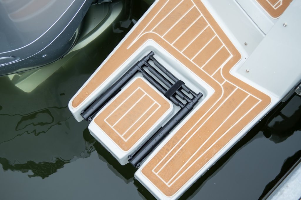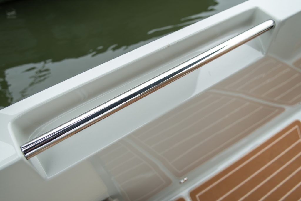 De geteste Danté V800 is een consoleboot die JG Boats in Polen bouwt. Het is een modern en sportief model, dat in twee verschillende uitvoeringen beschikbaar is: de V800 cabin en deze open V800. Het is een boot met een aantrekkelijke basisprijs van net onder de €50.000. Daarvoor krijg je een nette strakke romp, in zwart of wit met koelkast en toilet. Het is een tender die bedoeld is voor ruim water. Dat zie je al aan de buitenzijde. De boot heeft een verticale boeg, bekleed met een rvs plaat en voorzien van een traileroog. De boorden zijn glad, er is een lichte zeeg in het onderwaterschip, dat aan beide zijden voorzien is van terugvallende kimmen en dubbele sprayrails. Het polyesterwerk is degelijk uitgevoerd. De gelcoat is professioneel aangebracht en aan de binnenzijde is het laminaat mooi afgewerkt met topcoat. De vloeren zijn belegd met een mooie foam bedekking.