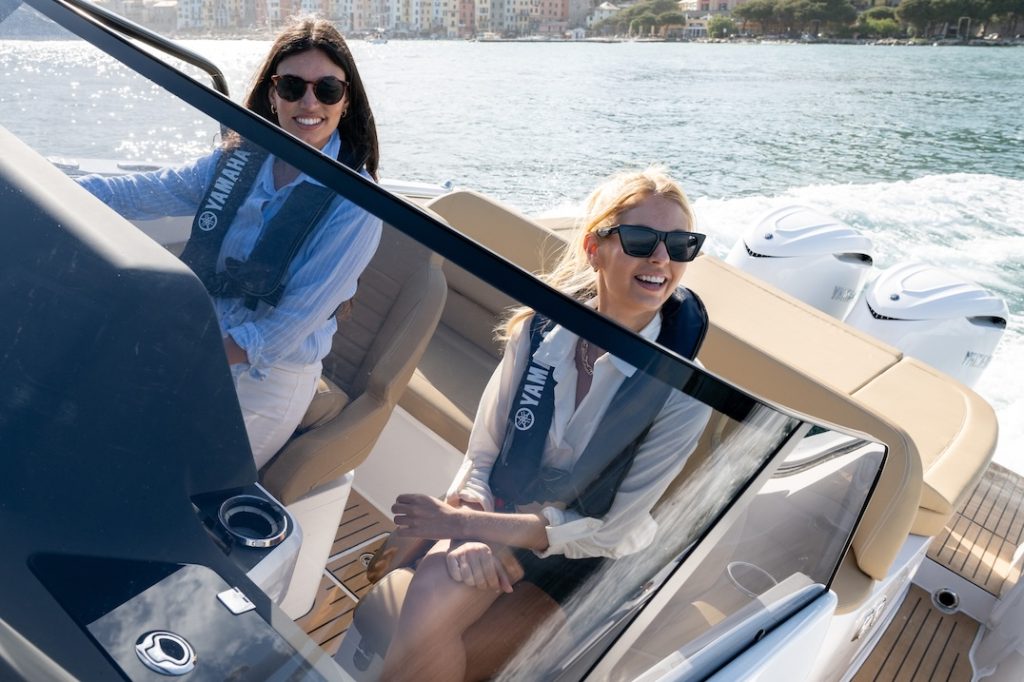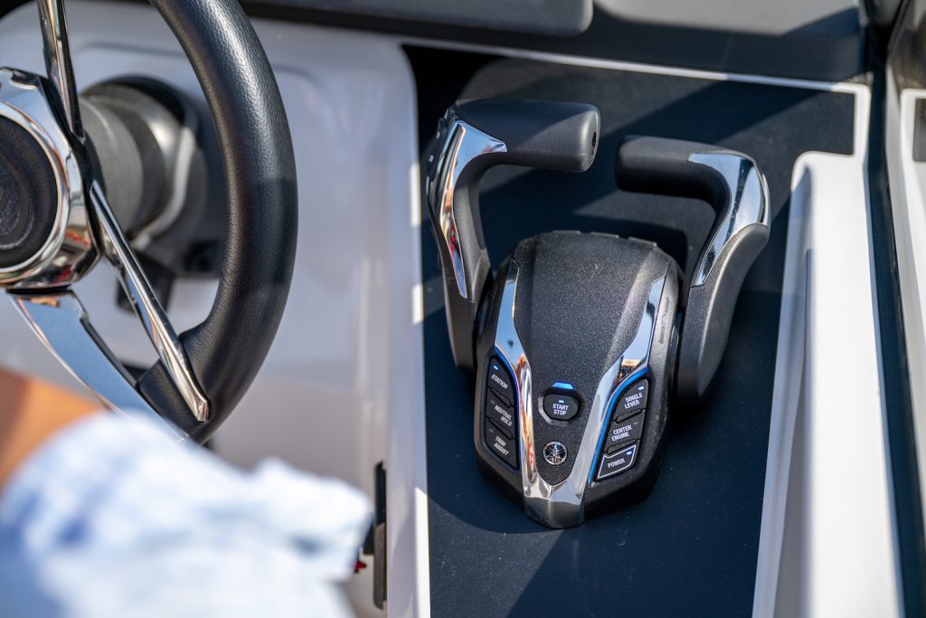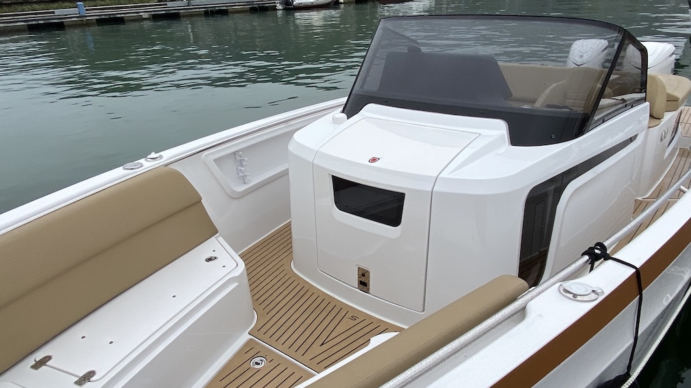 De console heeft het stuur aan de stuurboordzijde en daarnaast aan de rechterkant de mooie Yamaha gashendel en aan de andere kant een fraaie plek voor de Helm Master joystick. Er zijn grote vlakke schermen voor navigatie en motormanagement De stoelen zijn mooi gevormd, bieden fijne zijdelingse steun en er is een fijne voetensteun. Alles is mooi afgewerkt met leer en zelfs Gussi bekerhouders met ingebouwde koeling en verwarming. Deze zijn instelbaar voor het koud (tot -5) of warm (tot 50 graden) houden van de drankjes in de houders. Rondom de console is een fraaie driedelige getinte ruit die uitstekend beschermt tegen kou en regen. En daar hadden we op de koude, regenachtige aprildag bijzonder veel plezier van.