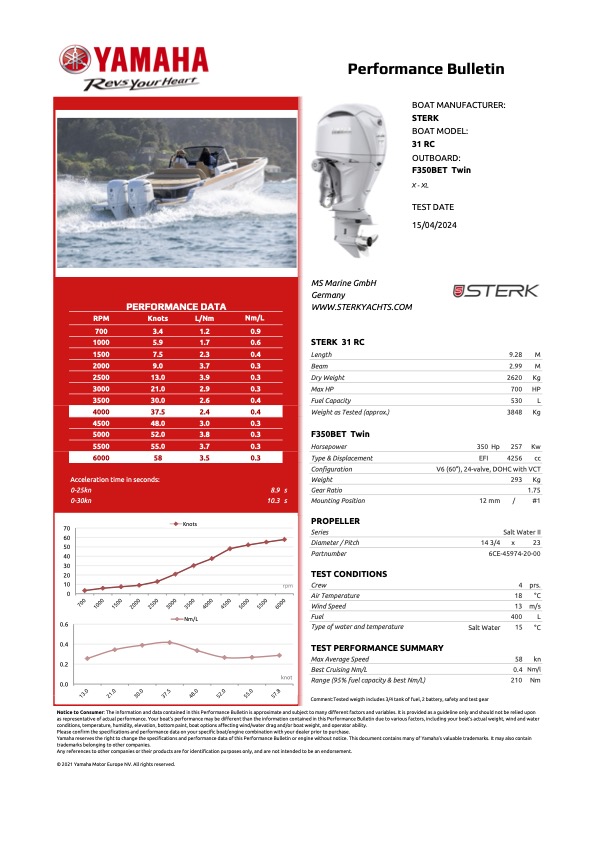 De testvaart op de 3,8 ton wegende Duitse Sterk 31 met twin F350 gaf een spectaculair beeld. De fenomenale prestaties zijn te danken aan de combinatie van een supersnel onderwaterschip en de nieuwe Yamaha F350 motoren. In 10 seconden bereikten we 30 knopen (56 km/u). Maar daarna leek er geen einde te komen aan de versnelling. Pas bij 58 knopen (107 km/u) konden we de deze waarde als topsnelheid noteren. Dat is echt supersnel en zie je zelden op een familieboot in dit formaat.