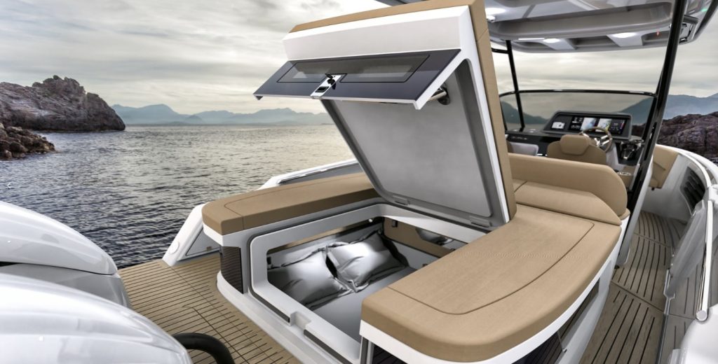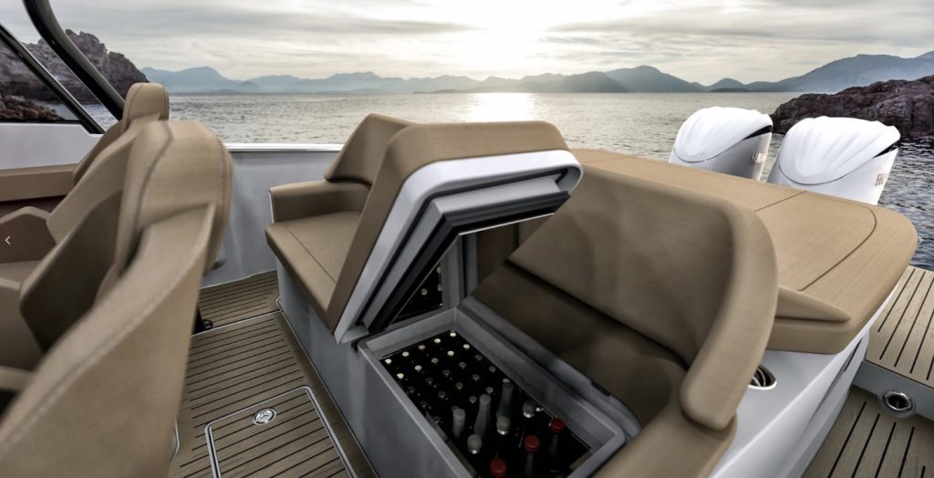 De console heeft het stuur aan de stuurboordzijde en daarnaast aan de rechterkant de mooie Yamaha gashendel en aan de andere kant een fraaie plek voor de Helm Master joystick. Er zijn grote vlakke schermen voor navigatie en motormanagement De stoelen zijn mooi gevormd, bieden fijne zijdelingse steun en er is een fijne voetensteun. Alles is mooi afgewerkt met leer en zelfs Gussi bekerhouders met ingebouwde koeling en verwarming. Deze zijn instelbaar voor het koud (tot -5) of warm (tot 50 graden) houden van de drankjes in de houders. Rondom de console is een fraaie driedelige getinte ruit die uitstekend beschermt tegen kou en regen. En daar hadden we op de koude, regenachtige aprildag bijzonder veel plezier van.