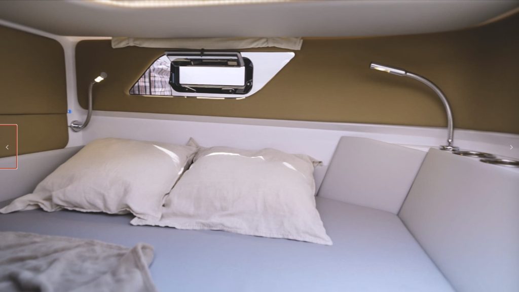 Aan de voorzijde van de console is een deurtje, waarachter je een volwaardig toilet met glazen waskom vindt. Verder is er voor in de kuip een V-vormige bank met opbergruimte er onder. In het boeisel is aan de binnenkant plek voor handrelingen, een tafeltje en spullen zoals een pikhaak. De afwerking is op hoog niveau en de constructie is onmiskenbaar Duits, dus degelijk.